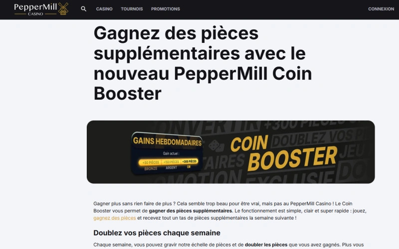 Les nouveaux joueurs belges qui s’inscrivent sur la plateforme peuvent profiter d’une offre de bienvenue attractive. Cette promotion comprend généralement un bonus de correspondance pouvant atteindre plusieurs centaines d’euros sur le premier dépôt. Le bonus de bienvenue casino PepperMill est réservé aux joueurs majeurs résidant en Belgique et nécessite un dépôt minimum pour être activé. Des conditions de mise s’appliquent, et il est recommandé de consulter les termes complets avant de réclamer l’offre pour bien comprendre les exigences.